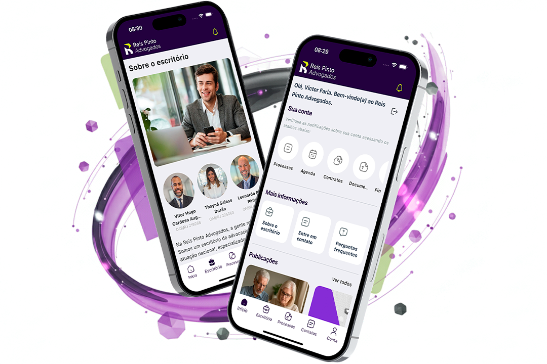 App Reis Pinto (iOS e Android): linha do tempo do processo, anexos e notificações em tempo real.